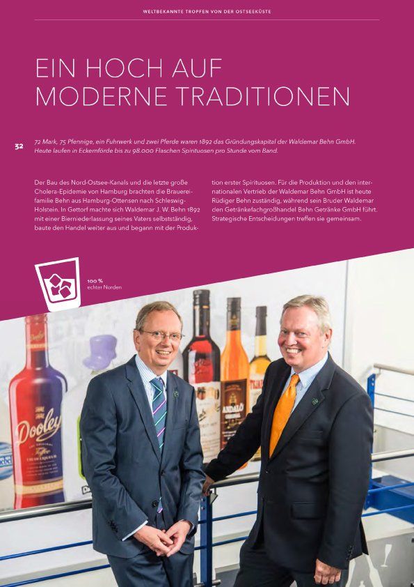 Einblicke ins Familienunternehmen BehnSeit 1892 verkauft die Familie Behn alkoholische Getränke. Heute laufen in Eckernförde bis zu 98.000 Flaschen Spirituosen pro Stunde vom Band. Ein Firmenporträt zum 125. Jubiläum, erschienen im Wirtschaftsland 2018